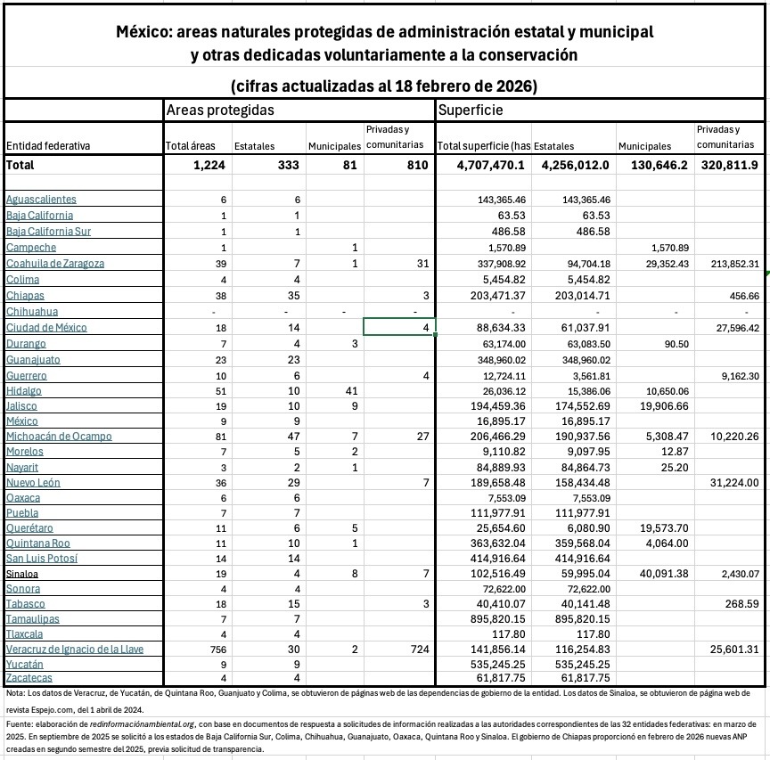 Con el objetivo de conocer la dimensión de la superficie protegida en el país bajo la modalidad de Áreas Protegidas, se solicitó información a los gobiernos estatales a través del Portal de Transparencia, sobre el número, superficie y fecha de creación de todas y cada una de las áreas protegidas en su entidad, tanto las que están bajo su jurisdicción, como las que corresponden al ámbito municipal.