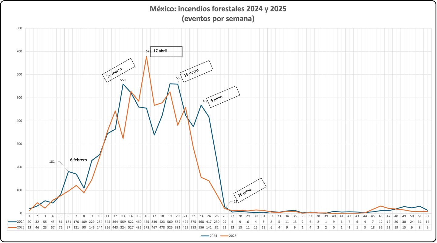 El cierre del año del 2025 en materia de incendios forestales nos reporta la Conafor un total de 6 mil 996 incendios en las 32 entidades federativas, lo cual cubrió un millón 208,375 hectáreas. Agrega que el 95 por ciento correspondió a vegetación en los estratos herbáceo y arbustivo, y el 5 por ciento a arbóreo. Estos datos demuestran que los incendios en 2025 fueron menores en 12 por ciento a los ocurridos en 2024. La superficie afectada también se redujo, en 28 por ciento.