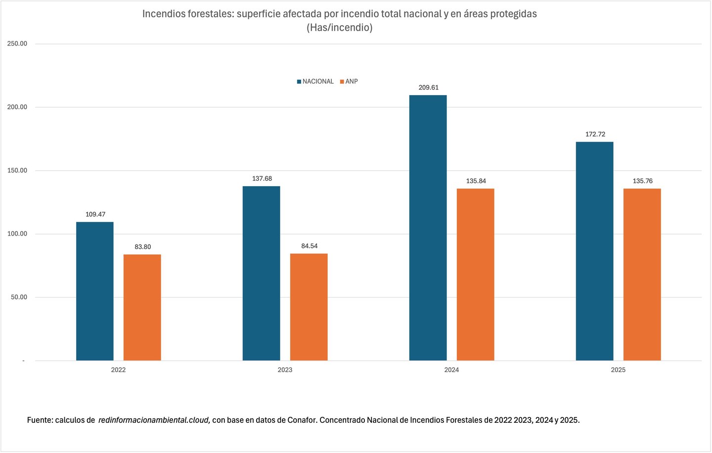 Sin embargo, revisando las cifras con cierto detalle observamos que los efectos de incendios por superficie afectada resultan ser mayores en las áreas protegidas que en el total del país en 2025. Como puede apreciarse en el cuadro correspondiente, del 2022 al 2024 crece las afectaciones de la superficie, pero en 2025, las afectaciones por hectárea por evento en el país, se reducen de las 209.61 hectáreas a 172.72 entre 2024 y 2025, en tanto las hectáreas afectada en las ANP se mantienen en las 135 hectáreas en cada año.