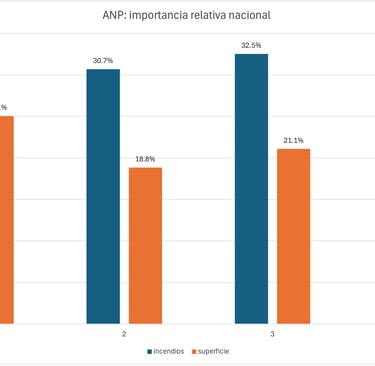 De acuerdo con los datos proporcionados por este sistema los incendios forestales en áreas protegidas significaron alrededor de un tercio del total de eventos registrados desde 2022 al 2025, únicos años que registra el sistema de información en áreas protegidas. Y la superficie afectada es de alrededor de un quinto del total de la superficie total que padeció incendios en el país para estos años, como se puede apreciar en la gráfica de ANP: importancia relativa nacional.