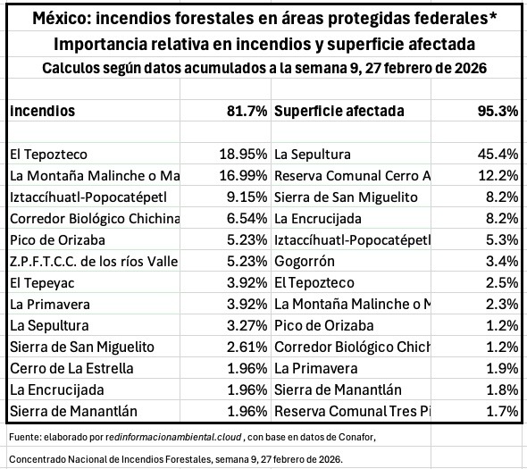 El cuadro siguiente da cuenta de que los efectos de los incendios en las áreas protegidas federales se ha concentrado prácticamente en dos áreas: La Sepultura, con el 45.4 por ciento, seguida por la Reserva Comunal Cerro Atravesado, del estado de Oaxaca, con 12 por ciento.
