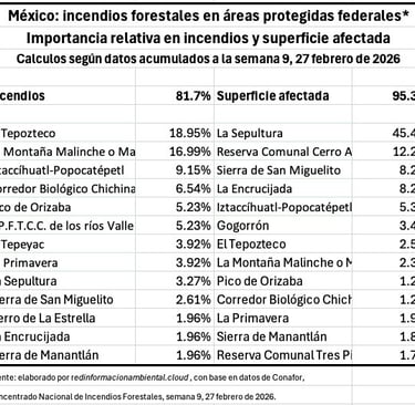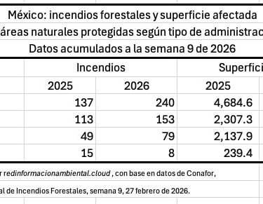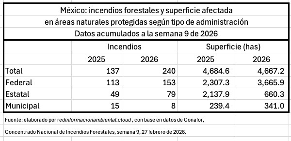 En esta semana, la 9 del año, se ha acelerado la frecuencia de los incendios, pero en las áreas protegidas el dinamismo ha sido mayor; ahora crecieron los eventos en 75 por ciento respecto al mismo periodo del año anterior: en 2025 sumaron 137 eventos, en tanto en 2025 llegaron a 240, como puede apreciarse en el cuadro siguiente. (Corresponde a las cifras acumuladas de enero a la fecha, 27 febrero).