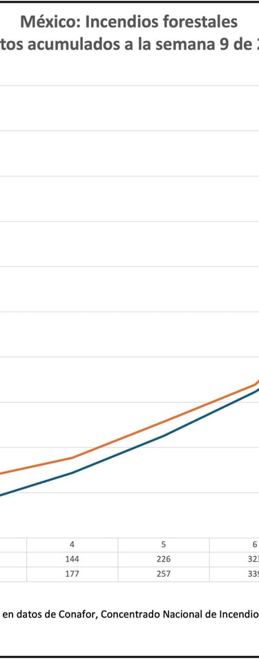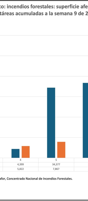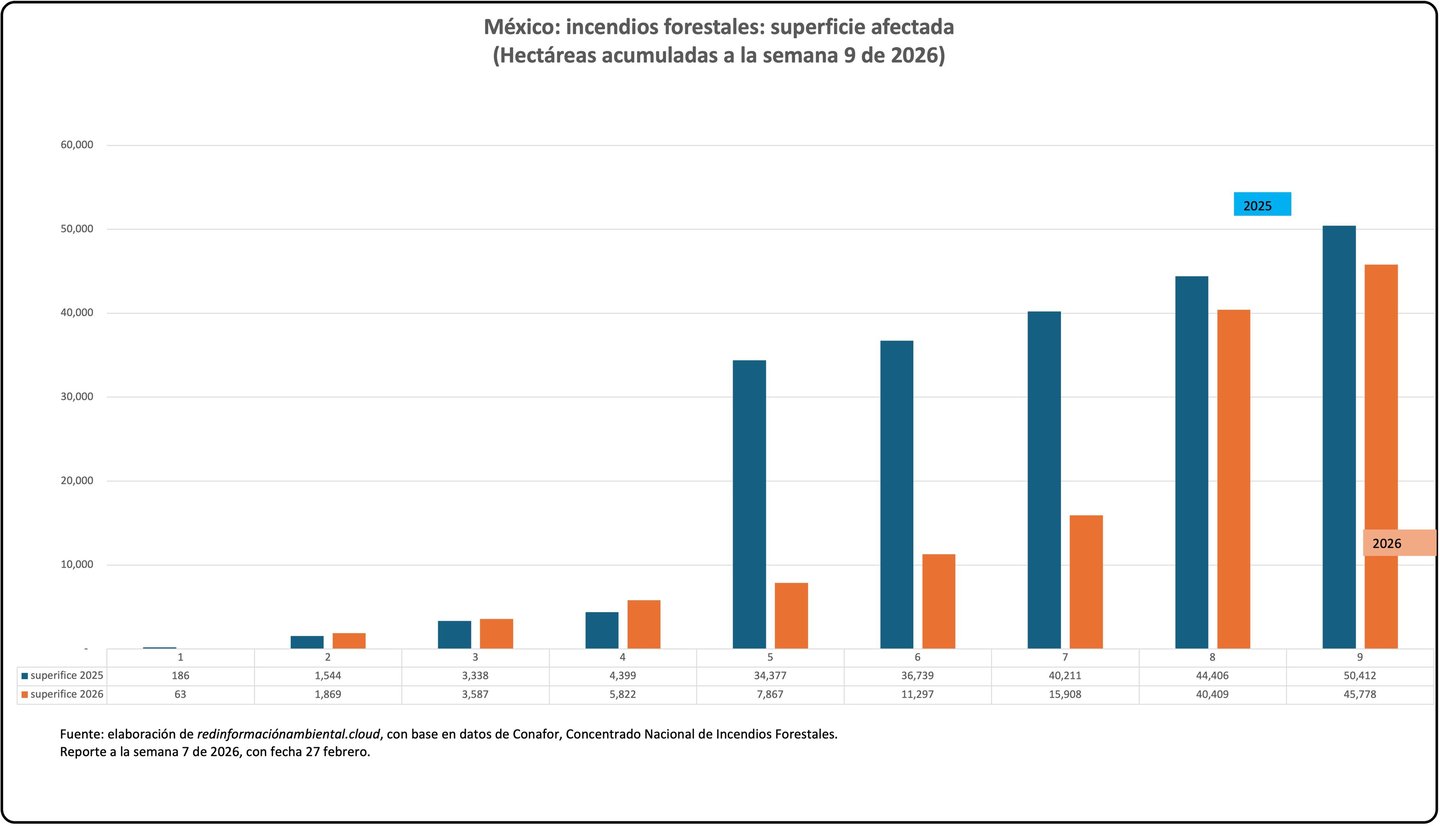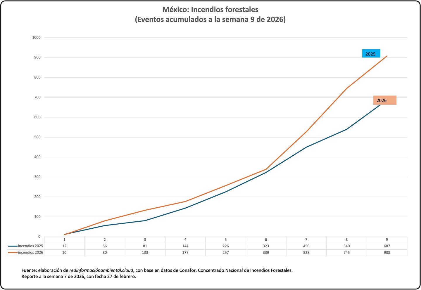 Los incendios en esta semana crecieron en conjunto casi el 22 por ciento respecto a la semana anterior, y fueron superiores en 32 por ciento respecto a los eventos en la misma semana del 2025. Esto muestra una aceleración de los incendios en este año, y sobre todo los efectos en la superficie afectada, ya que, aunque creció en 13 por ciento respecto a la semana anterior, lo cierto es que aún ésta se mantiene en 9 por ciento por debajo de la misma semana del año anterior.