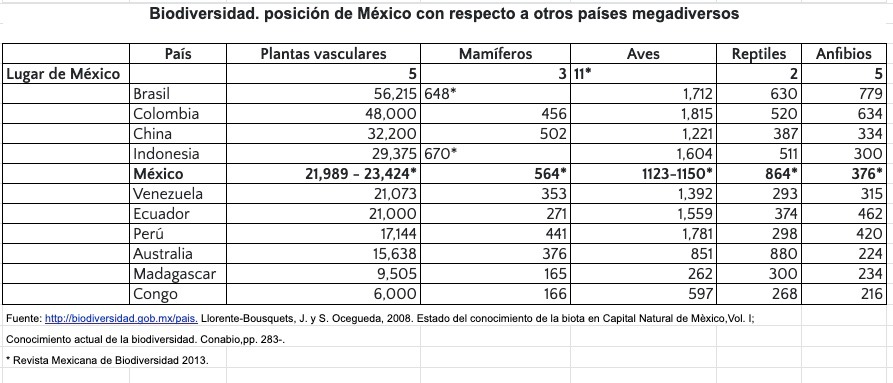 Según señala la página web de Conabio, el principal criterio para pertenecer al grupo de los países megadiversos es el endemismo. °Para ser megadiverso, un país debe tener por lo menos 5,000 especies endémicas de plantas. Otros criterios incluidos en el concepto son: diversidad de especies, diversidad de niveles taxonómicos superiores (géneros, familias, etc.), y diversidad de ecosistemas, incluyendo la presencia de ecosistemas marinos y de selvas tropicales (Mittermeier et al. 2004).°https://www.biodiversidad.gob.mx/biodiversidad/