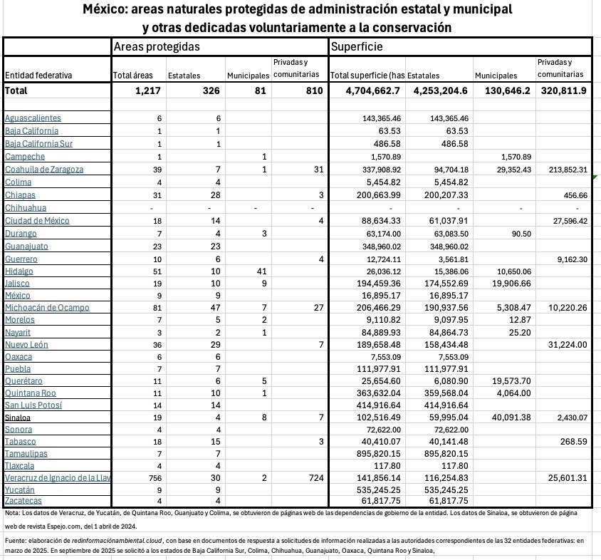 Con el objetivo de conocer la dimensión de la superficie protegida en el país bajo la modalidad de Áreas Protegidas, se solicitó información a los gobiernos estatales a través del Portal de Transparencia, sobre el número, superficie y fecha de creación de todas y cada una de las áreas protegidas en su entidad, tanto las que están bajo su jurisdicción, como las que corresponden al ámbito municipal.