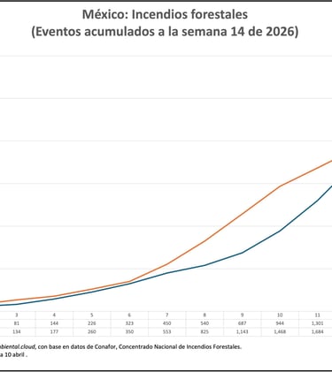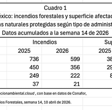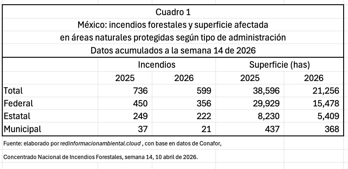 A la semana 14 del 2026, se registran menores incendios y menor superficie afectada en las áreas protegidas del país, siguiendo el mismo fenómeno en el país. Los datos acumulados en las áreas protegidas del país registran una caída del 19 por ciento respecto al mismo periodo del año anterior: la cifra del 2026 con 599 eventos, contra los 736 reportados en el periodo similar del 2025.