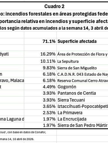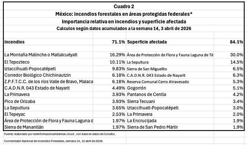 Como puede apreciarse en el cuadro 2, las áreas protegidas con mayor porcentaje de incendios fueron La Malinche, la cual concentró el 16 por ciento de los eventos en lo que va del año, seguida por El Tepozteco y el Iztaccíhuatl - Popocatétl, y ne tercer lugar por el corredor Biológico Chichinautzin. Todos Morelos.