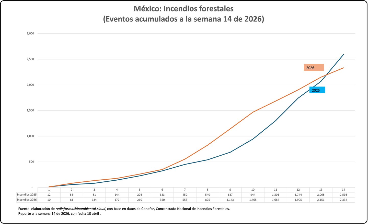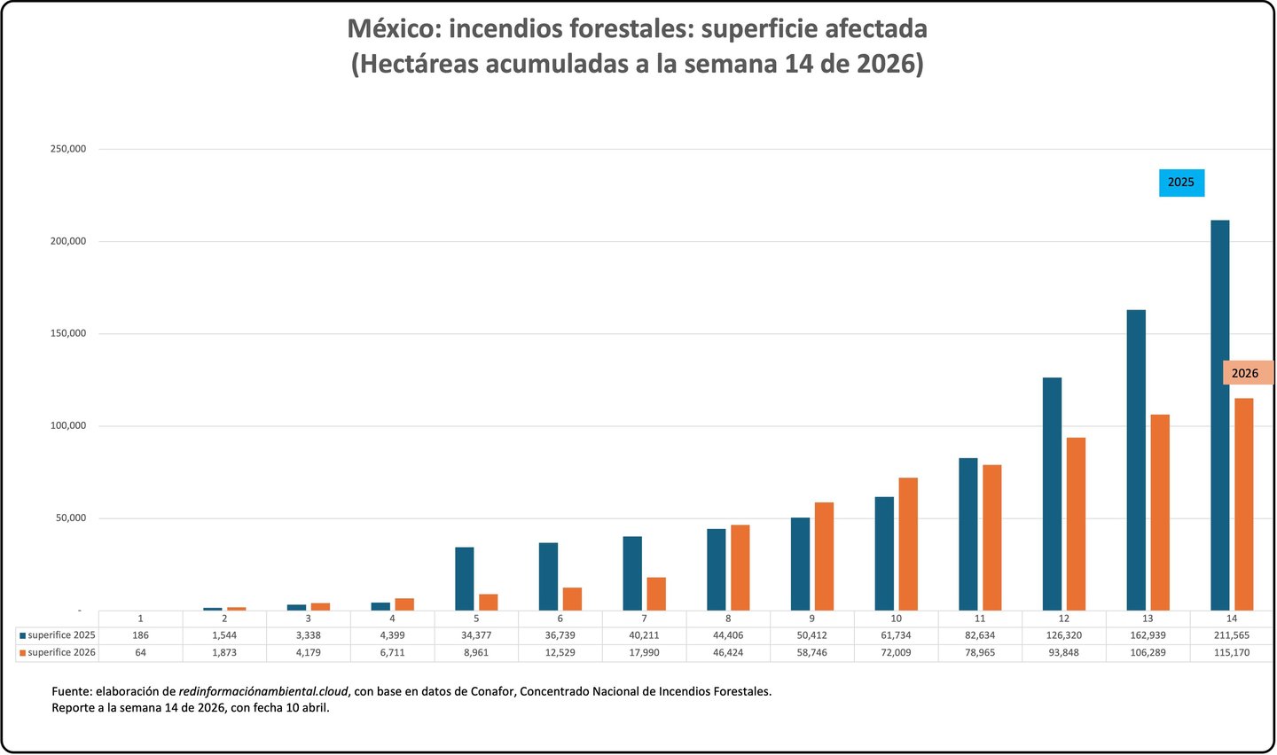 Fuente: Reporte Semanal Nacional de Incendios Forestales. (Información preliminar del 1 de enero al 9 de abril de 2026). Comisión Nacional Forestal. Coordinación General de Conservación y Restauración. Gerencia de Manejo del Fuego.